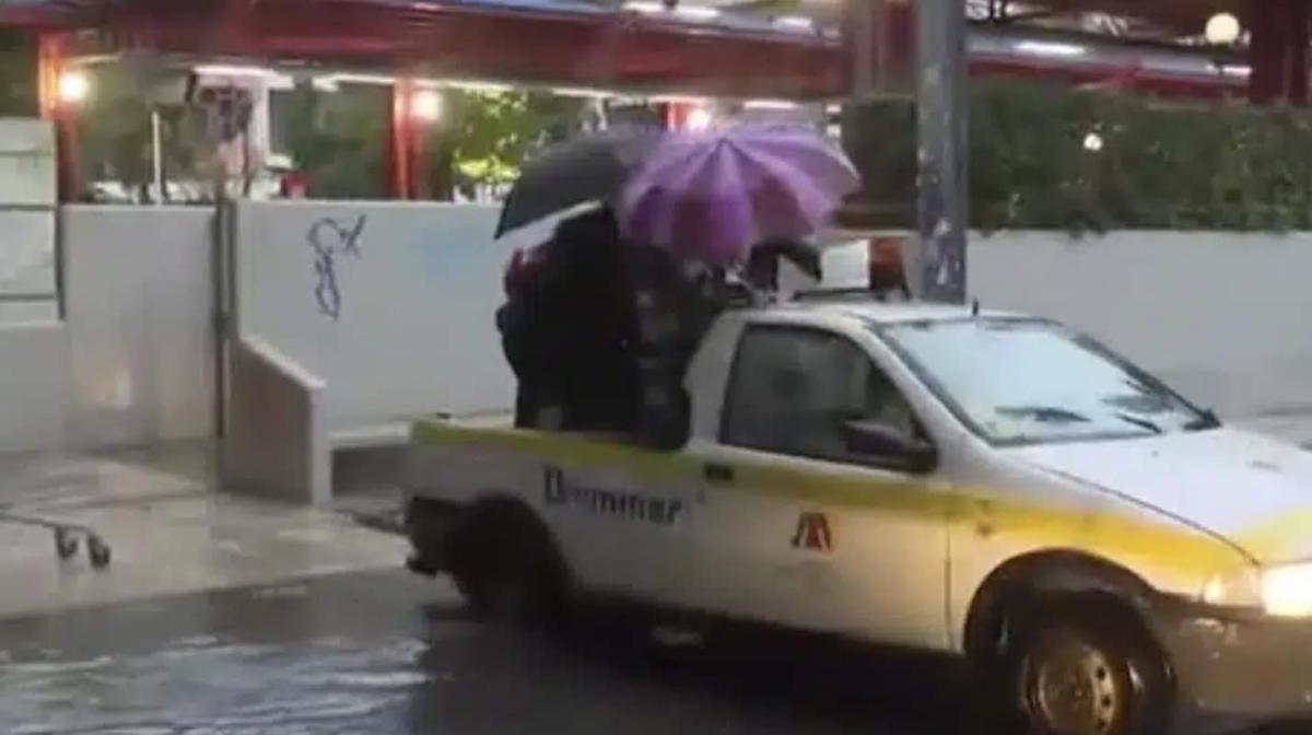Όπως φαίνεται στο βίντεο, πολίτες ανέβηκαν στην καρότσα του οχήματος του δήμου για να διασχίσουν τον δρόμο που είχε πλημμυρίσει.