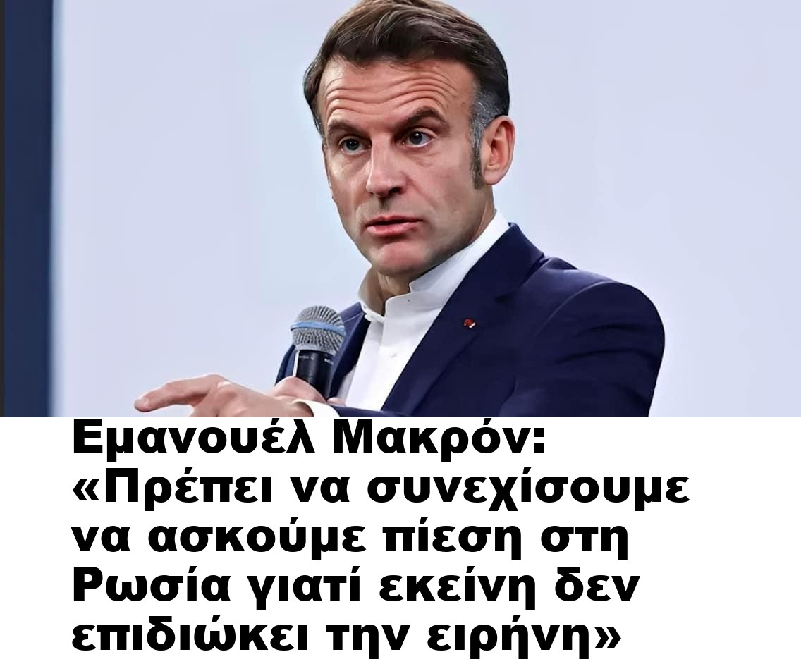 «Πρέπει να συνεχίσουμε να ασκούμε πίεση στη Ρωσία γιατί εκείνη δεν επιδιώκει την ειρήνη» δήλωσε σήμερα ο Γάλλος πρόεδρος, Εμανουέλ Μακρόν