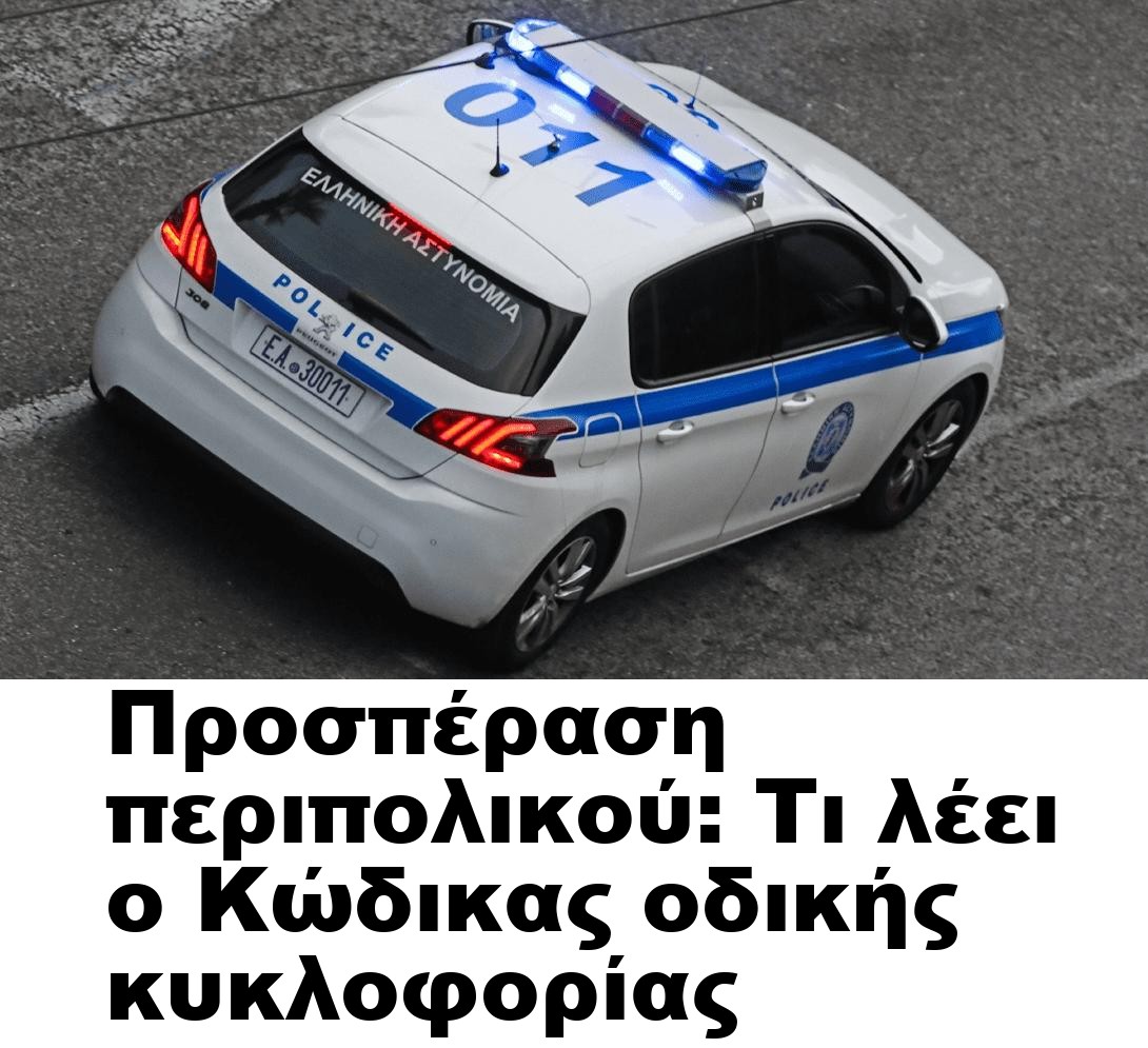 Το άρθρο 17 («Προσπέρασμα-Κυκλοφορία σε στίχους) του Κώδικα Οδικής Κυκλοφορίας δεν αναφέρει σε κανένα σημείο απαγόρευση προσπέρασης σε περιπολικό ή όχημα επείγουσας ανάγκης (βλ. ασθενοφόρο, πυροσβεστικό).