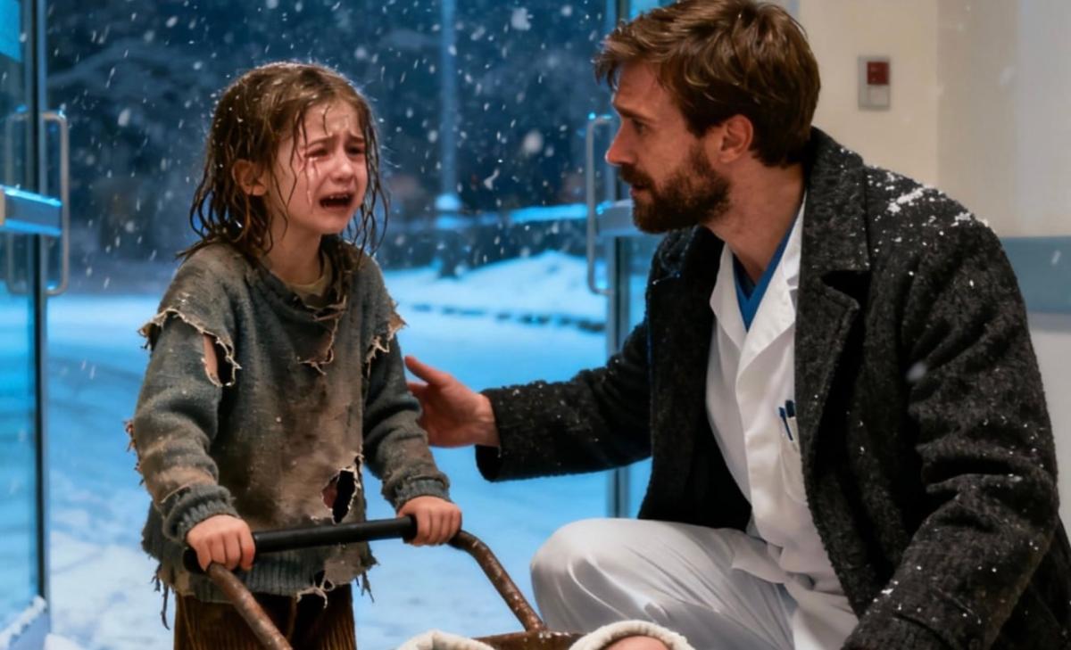Ένα μικρό κορίτσι, ξυπόλυτο που έτρεμε, έσπρωχνε έναν στραπατσαρισμένο καροτσάκι προς την είσοδο.