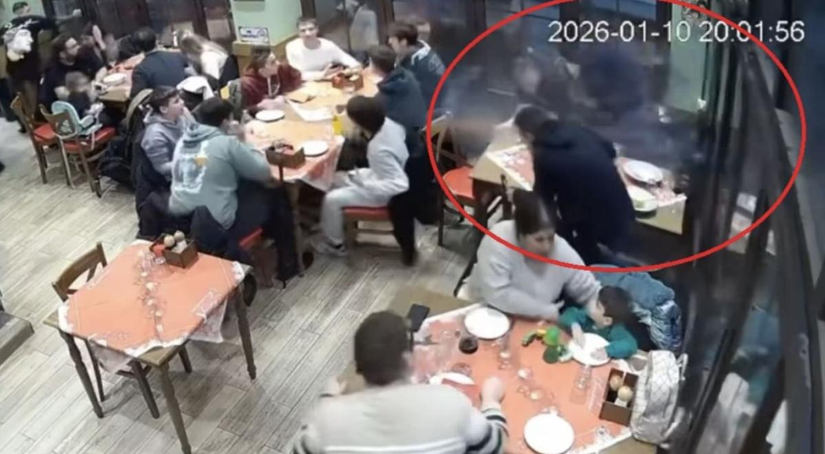 Από τις ισχυρές ριπές η τζαμαρία σε ένα εστιατόριο διαλύεται. Τα τζάμια εκσφενδονίζονται πάνω στους θαμώνες, οι οποίοι αρχίζουν και τρέχουν πανικόβλητοι για να καλυφθούν.