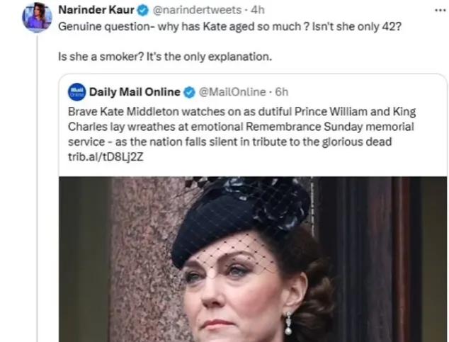 But after Kate’s appearance at the ceremony, TV personality Narinder tweeted about how she has “aged so much”.