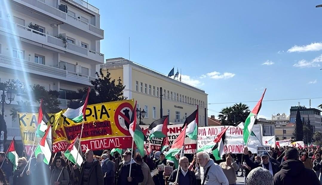 Η πορεία ξεκίνησε από το Πάρκο Ελευθερίας με το κεντρικό πανό να γράφει «Σπέρνουν τον όλεθρο στη Μέση Ανατολή. Έξω η Ελλάδα από τη σφαγή».