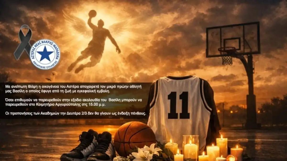 Την δυσάρεστη είδηση έκανε γνωστή ο σύλλογος Αστέρα Νέας Μάκρης με ανακοίνωση του στην οποία αναφέρεται πως ο μικρός Βασίλης έφυγε ξαφνικά από τη ζωή με εγκεφαλική εμβολή, που προκάλεσε σοκ και θλίψη στην τοπική κοινωνία.