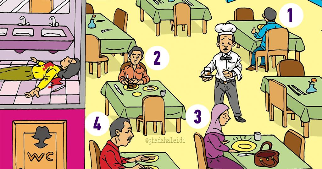 Όπως θα παρατηρήσετε και στο σκίτσο υπάρχει μια νεκρή γυναίκα στην τουαλέτα. Οι ύποπτοι είναι αριθμημένοι από το ένα έως το τέσσερα.