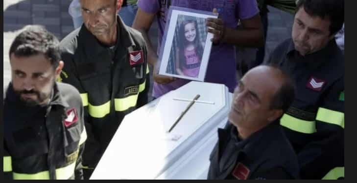 Το αποκαλυπτικό λευκό φέρετρο ενος παιδιού ξεχώριζε στη σειρά με τα άλλα φέρετρα, η ιστορία του μικρού κοριτσιού δυνάμωσε την καρδία της Ιταλίας κατά την διάρκεια της κηδείας για 35 από τους 291 ανθρώπους που σκοτώθηκα στο μεγάλο σεισμό που έπληξε το κέντρο της Ιταλίας. Τουλάχιστον ακόμα 400 άνθρωποι τραυματίστηκαν.