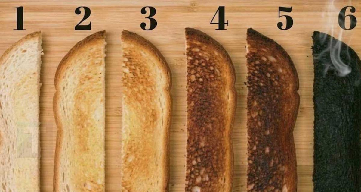 Έξι φέτες ψωμιού, τοποθετημένες στη σειρά και αριθμημένες από το 1 έως το 6 — καθεμία δείχνει διαφορετικό επίπεδο ψησίματος. Στη μία άκρη, η φέτα #1 είναι ελάχιστα ψημένη: ανοιχτόχρωμη, μαλακή και ζεστή. Στην άλλη, η φέτα #6 είναι εντελώς καμένη — σκούρα, τραγανή και σχεδόν να καπνίζει.